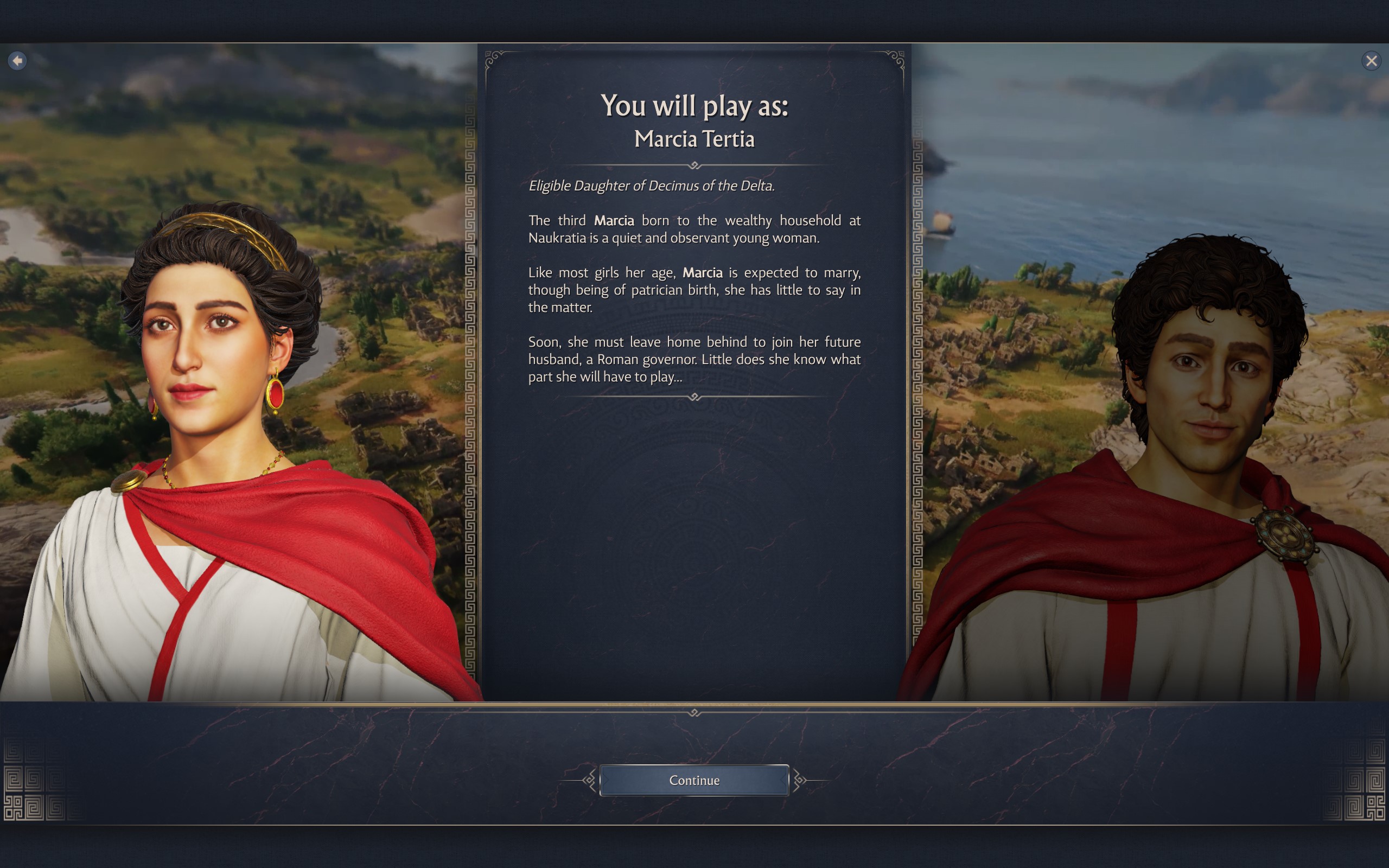 Son yıllarda birçok oyunda gördüğümüz şekilde 2 farklı karakterden birisini seçerek başlıyorsunuz oyuna. Bu karakterlerden ilk Marcia Tertia (3. Marcia), Decimus’un kızı. Diğer karakterimiz Marcus Naukratius ise, Decimus’un oğlu. İki karakterin hikayelerinde ufak tefek değişiklikler söz konusu olsa da nihayetinde senaryo büyük oranda aynı şekilde ilerliyor ve aynı noktaya varıyor.