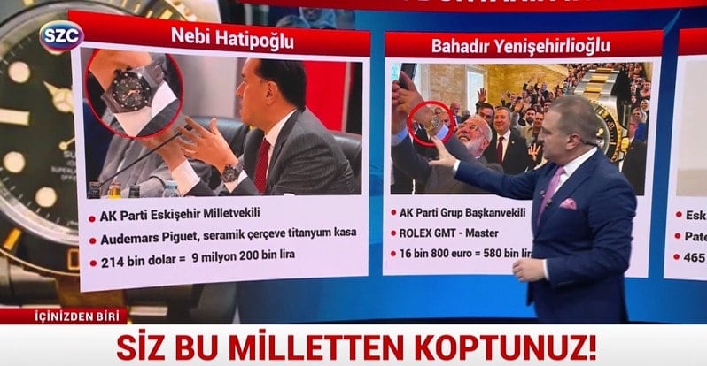 “- İYİ Parti’den AKP’ye geçen Nebi Hatipoğlu meclisteki toplantısına gidelim. Kolundaki saate bakalım. Markası Audemars Piguet, seramik çerçeve titanyum kasa. Değeri nedir 214 Bin dolar. Bugünün kuru ile 9 Milyon 200 Bin lira. Servet düşmanı değiliz. Nebi Bey önemli iş insanlarından biri.”